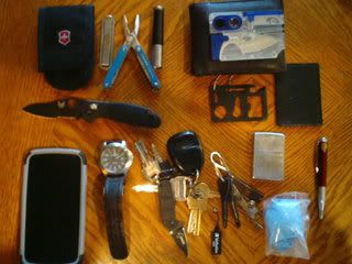 i carry a few things, widgets (small pry bars so you don't need to use your knife) blast match, spyderco native, dog repellent (it's actually a job thing) pocket pal knife sharpener, pen, Gerber flick multi tool, tweezers, whistle, little reflecting tool (not a mirror but make for signaling) hand sanitizer wipes, kubaton for my keys chain.